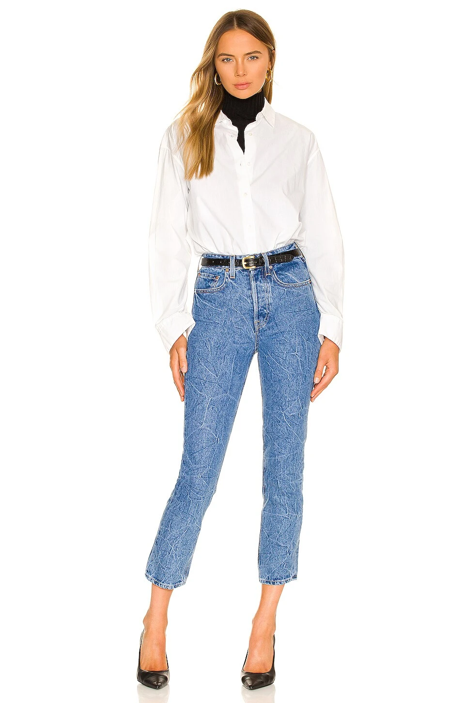 - The Karolina Straight Crop, but make it spunky. The Bayside wash gives one of GRLFRND’s classic styles a little retro edge with eye-catching crackle fading. Meanwhile, the snug waist and slim cut ensures flattering style for any outfit.