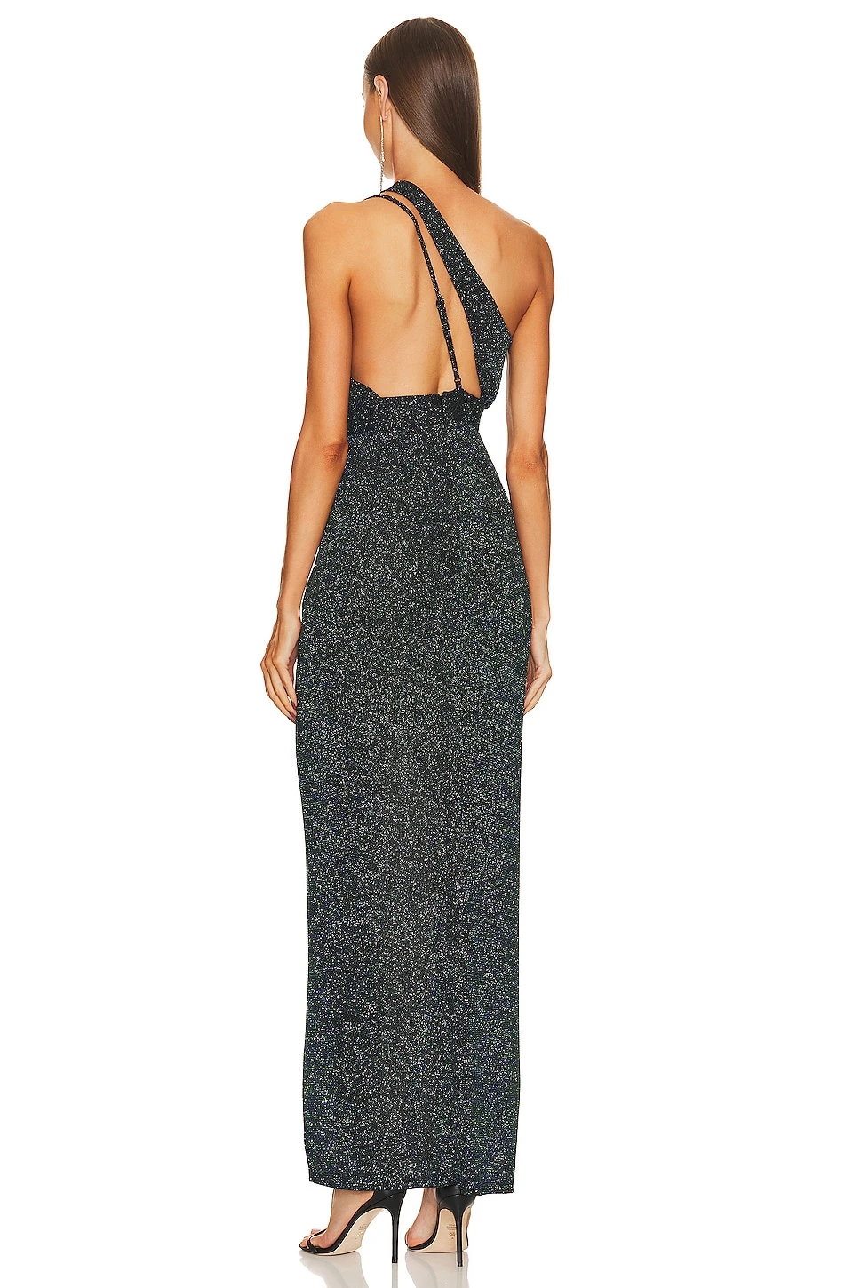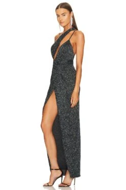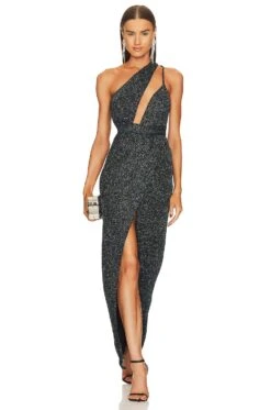 Self: 93% nylon, 4% elastane, 3% metallic.Lining: 90% polyester, 10% spandex. Made in China. Machine wash. Fully lined. Hidden side zipper closure. One shoulder styling with adjustable shoulder strap. Front diagonal cut-out.Metallic jersey fabric with front slit. Revolve Style No. MELR-WD757. Manufacturer Style No. MCD1217 H23.